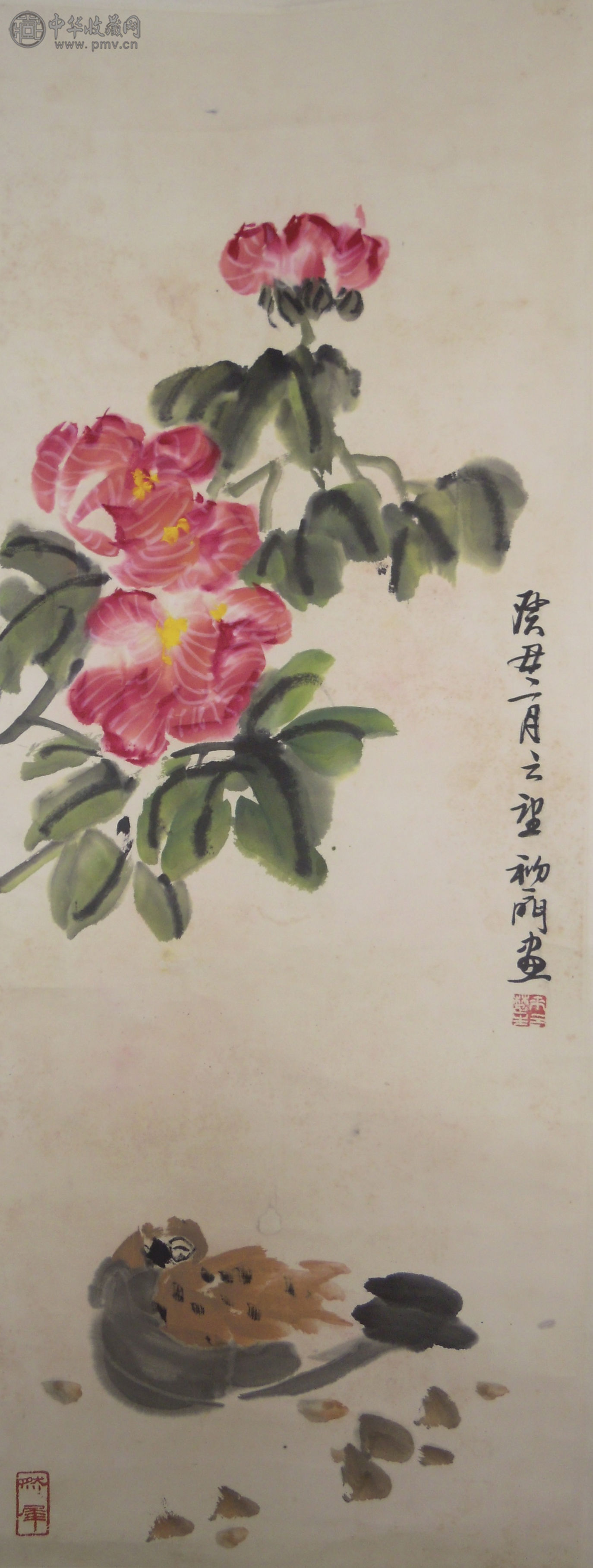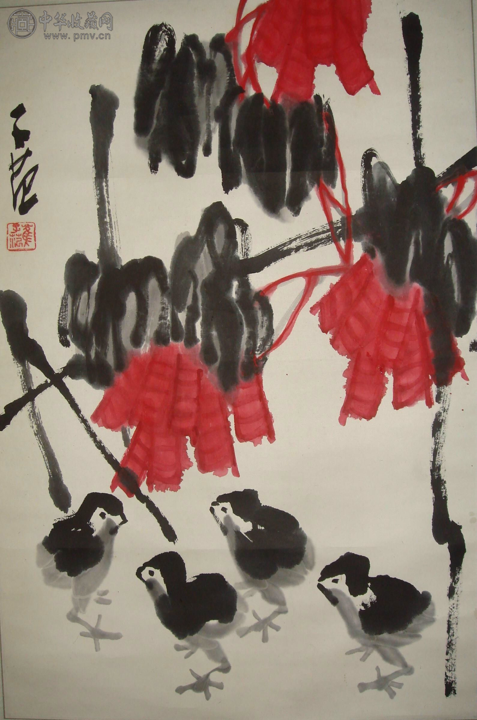 崔子范 《花卉小鸡》 68x46cm