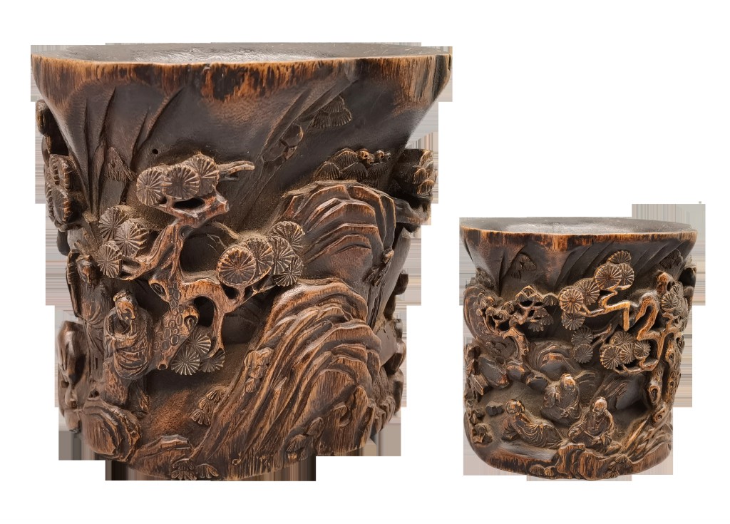 沉香木雕松下人物笔筒
