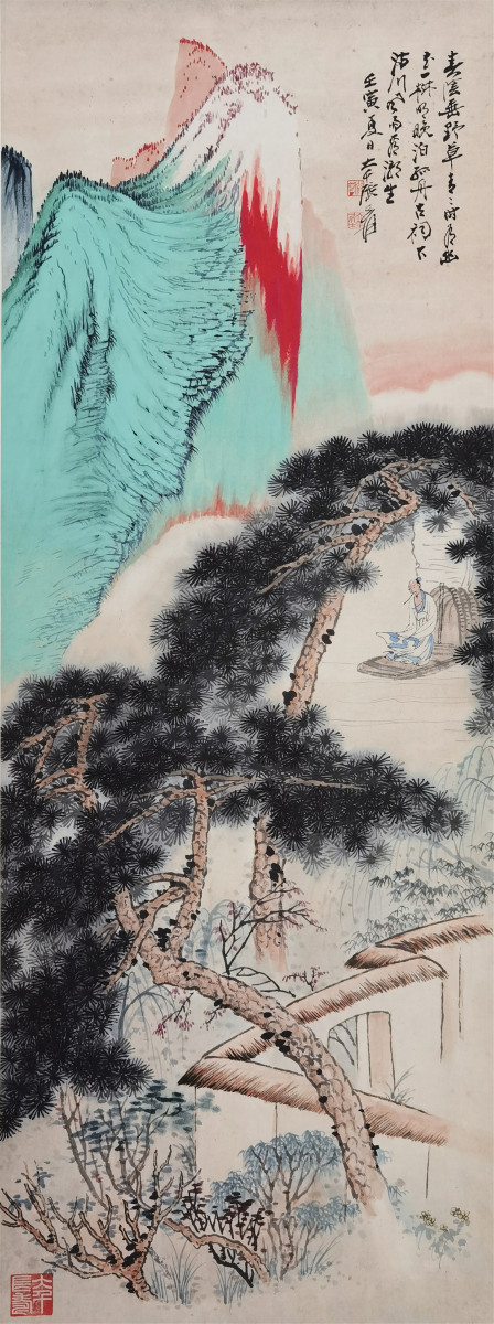 张大千(1899-1983),名爰,字季爰,四川内江人,二十世纪中国画坛最具传奇色彩的国画大师,与张善子、昆仲创立“大风堂画派”。无论是绘画、书法、篆刻、诗词都无所不通。早期习古人书画,特别在山水画方面卓有成就。泼墨画工被西方艺坛赞为“东方之笔”